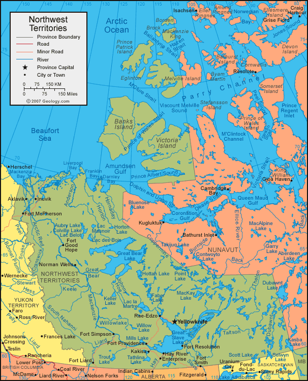 - La Mackenzie Highway (route 1): Depuis le Nord de l’Alberta, la route entre aux Territoires du Nord-Ouest où elle rejoint le fleuve Mackenzie près de son point d’origine.